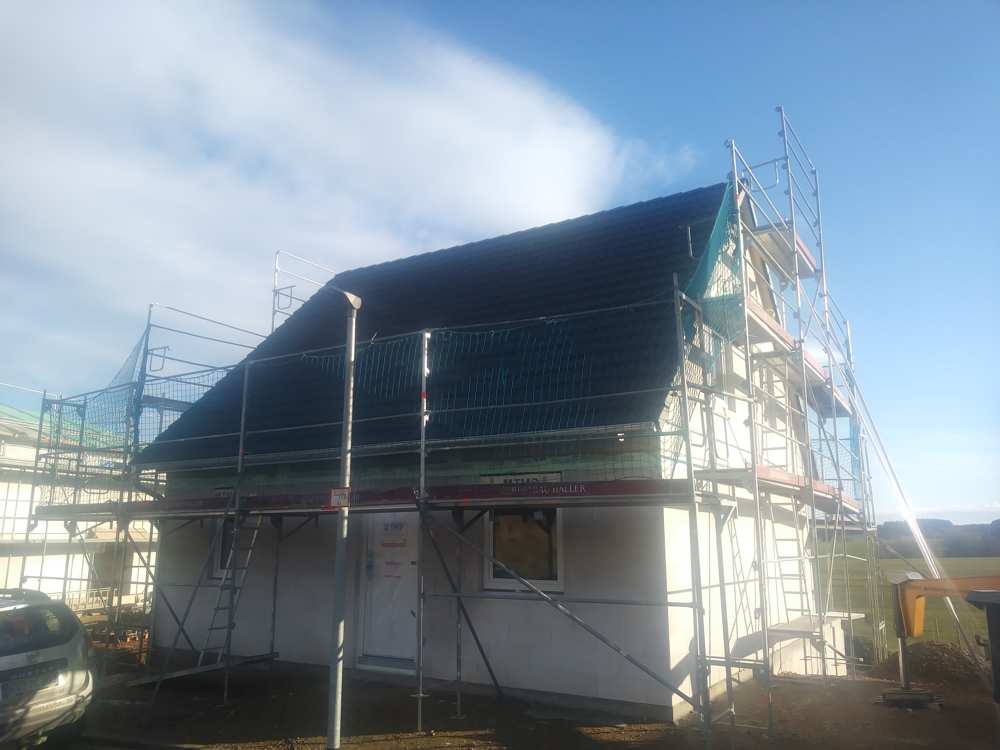 Bauarbeiten an Haus Obergeschoss mit Gerüst